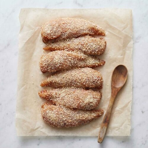 Dip each tender into egg, then lightly coat with breadcrumbs and parmesan.